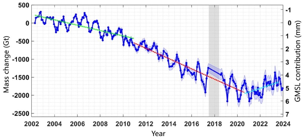 The findings come from researchers at Shanghaiโs Tongji University, who analyzed more than twenty years of satellite measurements collected by NASAโs Grace and Grace Follow-On missions. These satellites track tiny variations in Earthโs gravity field, allowing scientists to measure changes in ice mass with precision.